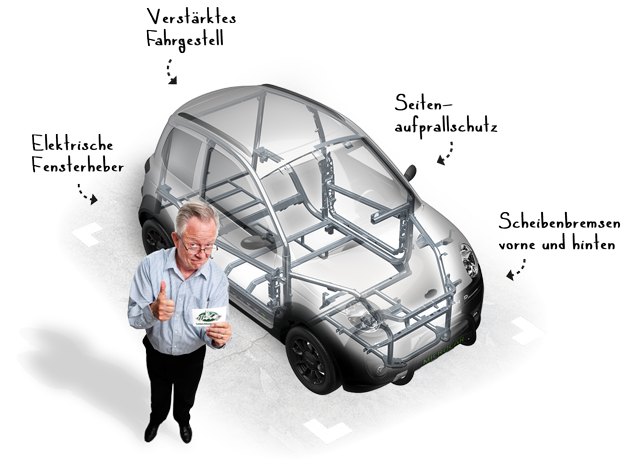 Sicherer als Fahrrad oder Moped dank vier Rädern, geschlossener Fahrerkabine, Seitenaufpallschutz und Stauraum im Kofferraum